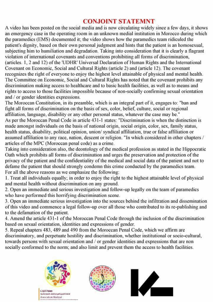 A video has been posted on the social media and is now circulating widely since a few days, it shows an emergency case in the operating room in an unknown medial institution in Morocco during which the paramedics (EMS) documented it; the video shows how the paramedics team ridiculed the patient’s dignity, based on their own personal judgment and hints that the patient is an homosexual, subjecting him to humiliation and degradation. Taking into consideration that it is clearly a flagrant violation of international covenants and conventions prohibiting all forms of discrimination, (articles. 1, 2 and 12) of the ‘UDHR’ Universal Declaration of Human Rights and the International Covenant on Economic, Social and Cultural Rights (article 2) and (article 12). The covenant recognizes the right of everyone to enjoy the highest level attainable of physical and mental health. The Committee on Economic, Social and Cultural Rights has noted that the covenant prohibits any discrimination making access to healthcare and to basic health facilities, as well as to means and rights to access to those facilities impossible because of non-socially confirming sexual orientation and / or gender identities expressions.