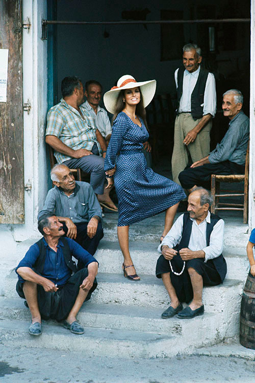 American actress Raquel Welch with a group of men on the set of the film ‘The Beloved (aka Sin and Restless)‘ directed by George P. Cosmatos, in Cyprus 1970.
