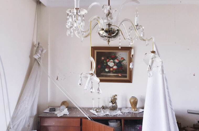 Next to the bed, there is a bouquet of flowers that has the lifespan of the exhibition; the artists tell me that the flowers serve as a temporal allegory for the impermanence of space and context. The flowers are ‘fresh’ for the duration of the exhibition, after which they begin rotting in a way that metaphorically presents the ending of context, and thus of intimacy. When I ask further about the personal significance of the flowers, both Randa and Lara told me that having a presence of flora in the various rooms and spaces that they’ve navigated in their ongoing periods of transience has allowed them to experience some permanence or continuity in new and unfamiliar places. “It started a bit intuitively, we were doing a residency in Paris. The place we were staying wasn’t very comfortable, and without thinking much we began to gather bouquets. It was made of branches from streets and other places, as flowers are quite expensive in Paris. Then, we used them to inhabit the room we were staying in. The purpose was to make it homier, especially as we were only staying for two months so we were not going to renovate the room.” An opportunity to add intimacy to an otherwise soulless room.