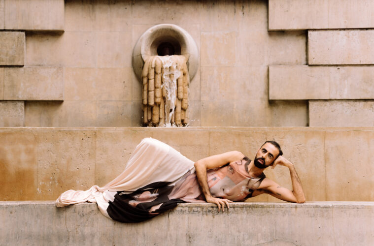 Dress; EMERGENCY ROOM. Shoes; Untitlab. Wig Hat; Christian Ye. Photography by Mohsen Othman. Styling by Wassim Lahmer. Makeup by Tamara Hanna.