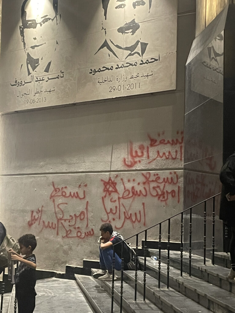 For Awlad Yanayer, the question of reigniting the Tahrir moment lingers heavily. Attempts to answer this question have taken place online, in public and private forums, but it remains difficult to find a new site for liberation amidst the state’s sporadic repression. For a moment, it seemed like the stairs of the Journalists Syndicate, in the heart of downtown Cairo and roughly 1.5 km away from Tahrir Square, was the contemporary site of liberation; the place where we could begin to occupy space. When everywhere else was silenced in Egypt, the stairs rang loud with demands for a ceasefire and chants to cut ties with the Zionist state. But unfortunately, not everyone made it home from the stairs.