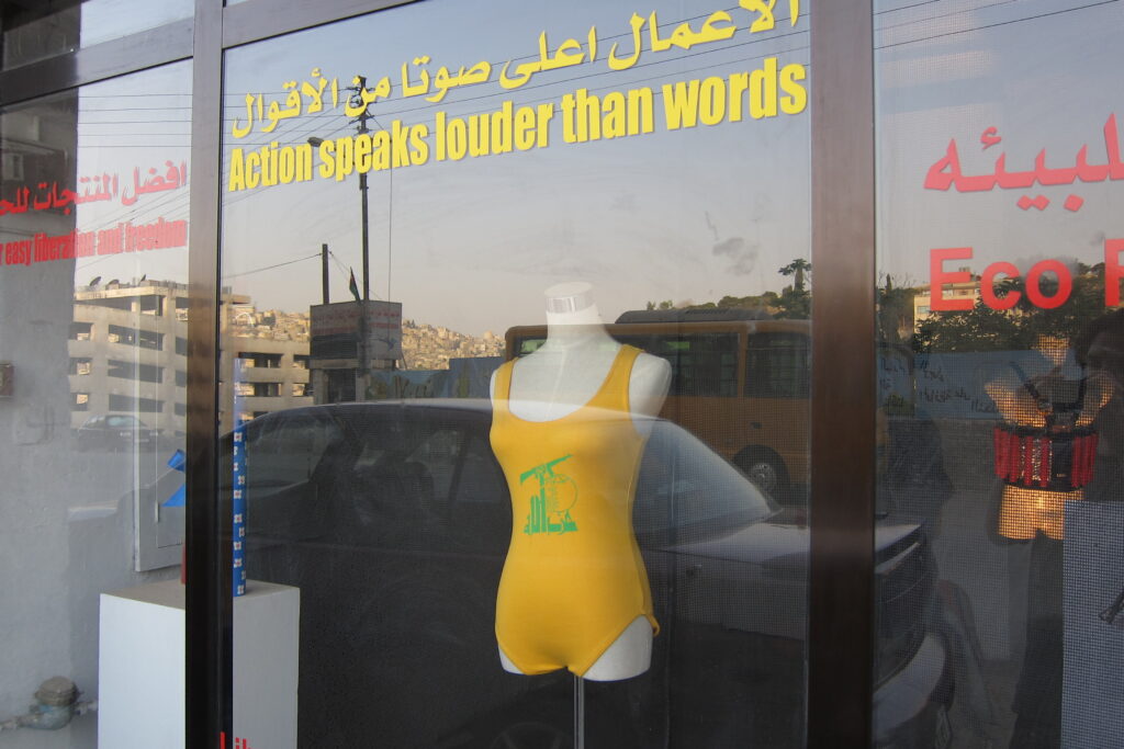 In 2012, I created a ‘shop’ installation at a newly opened art space in Amman, ‘Why Not Sneeze’, which was formerly a car mechanic’s garage in Jabal Al Lweibdeh. It was after the revolutions of 2011 in the region, and the display had materials that were recognized as revolutionary; blank signs, Molotov bottles, spray paint, eggs, etc. One of the sculptures was a yellow swimsuit imprinted with the logo of Hezbollah, displayed on a mannequin.