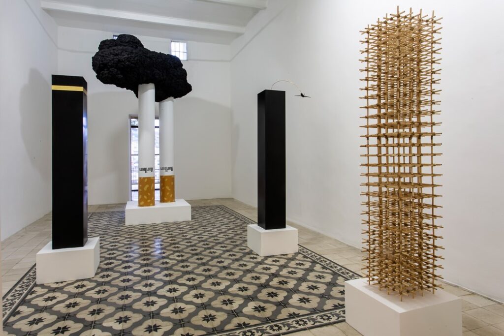 From left: Tower with golden stripe (painted stainless steel, electrical motor, gold leaf); Marlboro cigarettes (mixed media); Tower with airplane (painted stainless steel, electrical motor, thermoplastic); and Scaffolding (wood, jute string). Exhibited at Darat al Funun, 2021.
