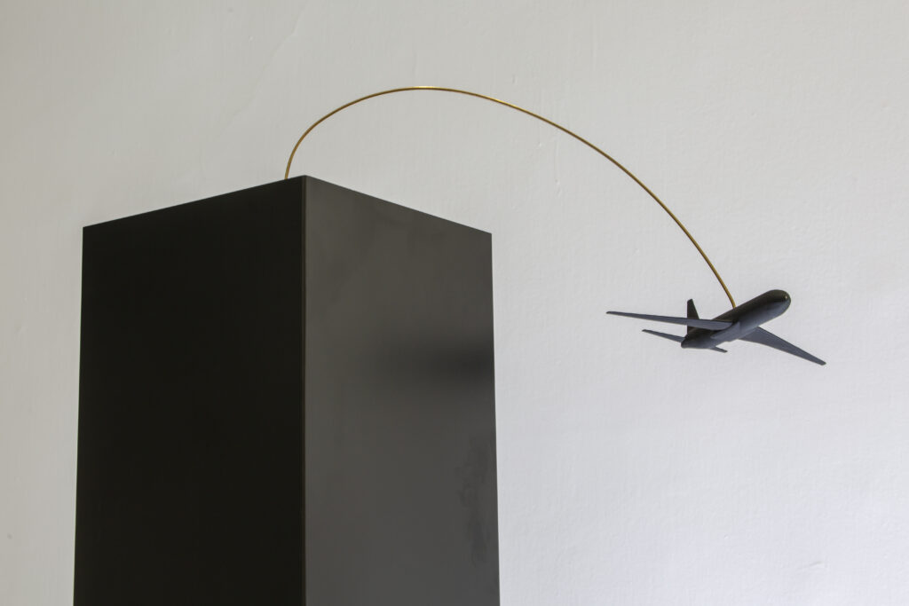 Tower with airplane, 2021. Painted stainless steel, electrical motor, thermoplastic. Exhibited at Darat al Funun.